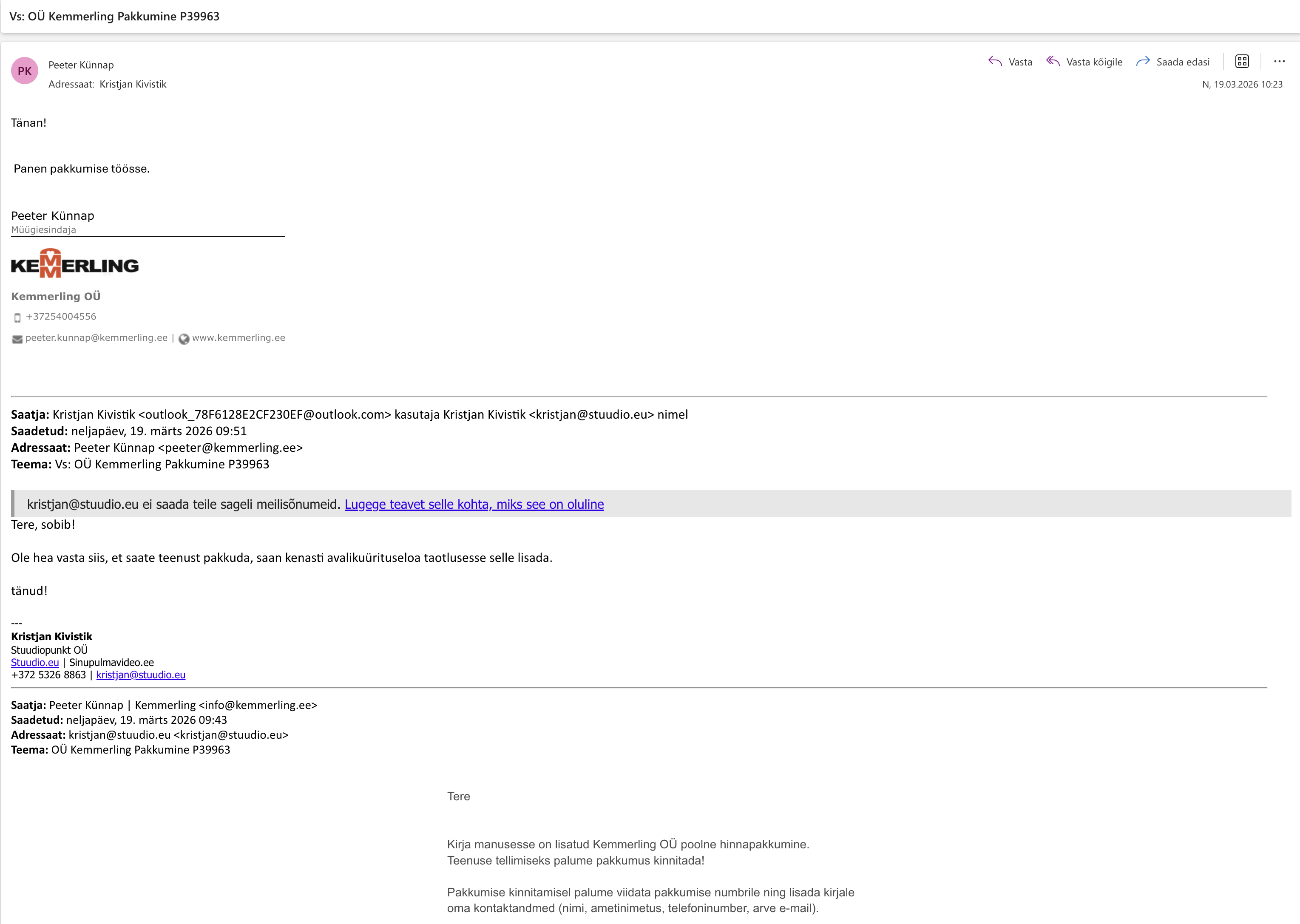 Käesolevad hinnad kehtivad 2 kuu jooksul peale pakkumise heakskiitu. Juhul kui mingi kulukomponendi hinnad turul muutuvad rohkem kui 10% on osapooltel õigus alustada hinnaläbirääkimisi uuel tasandil. Lugupidamisega, Elis Vahemets Lääne regiooni müügiesindaja +372 54470060 [email protected]