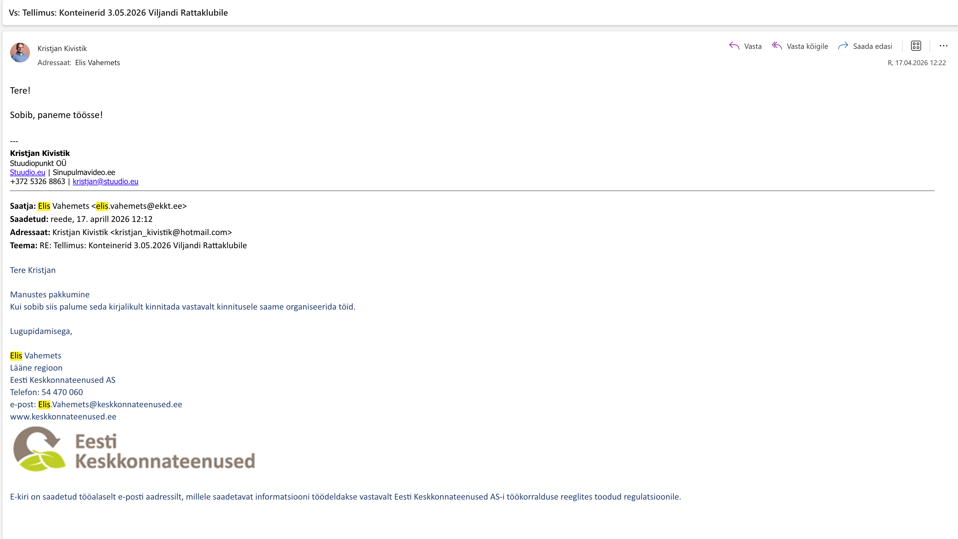 Klient teostab transpordi. Konteinerid väljastatakse 30.04.2026 Musta tee 9, Viljandi aadressilt (kell 8.00 -16.30 vahemikus) Klient tagastab konteinerid 04.05.2026 Musta tee 9, Viljandi aadressile (kell 8.00 - 16.30 vahemikus) Pakkumine sisaldab konteinerite renti, jäätmete käitlust ja konteinerite pesu. Kompleks teenuse pakkumine on 185,00€ Hinnale lisandub käibemaks 24% *Juhul kui konteinereid ei ole tähtaegselt tagastatud on õigus teenuse osutajal küsida täiendavat renti 0,50€/päev/konteiner millele lisandub käibemaks